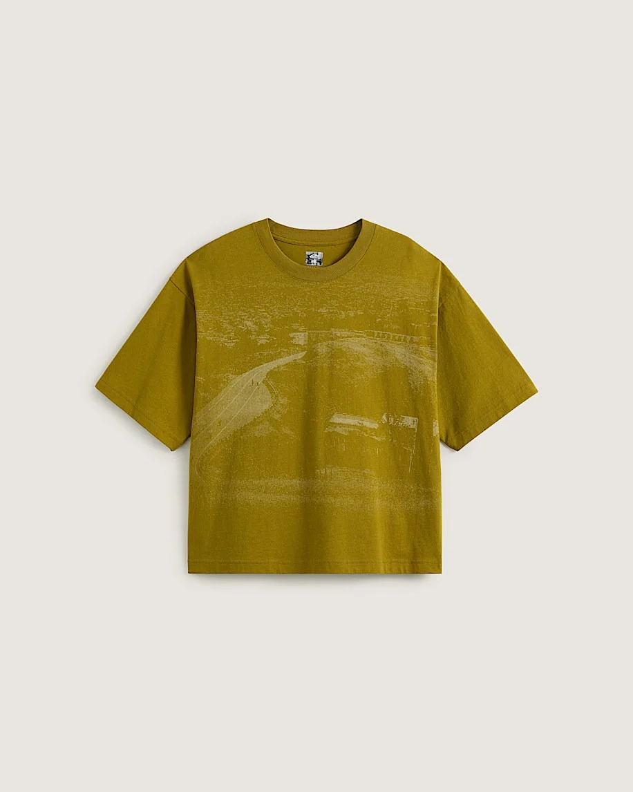 Style VN000PNKEMJ An everyday cotton tee gets Atiba's signature touch with artwork of a faded hill bomb on the front, giving a dreamy feel to this golden hue. Custom Vans logo artwork from legendary graffiti artist Eric Haze tops off Atiba's nod to skateboarding. A classic crewneck, ribbed collar for structure, and 5-Checkerboard embroidery round out this uniquely wearable and comfy closet staple. Details - Short sleeve crew neck T-shirt - Screen print artwork - 5-Checkerboard embroidery detail - Vans x Atiba x Haze Skateboarding label package - Loose fit - 100% cotton