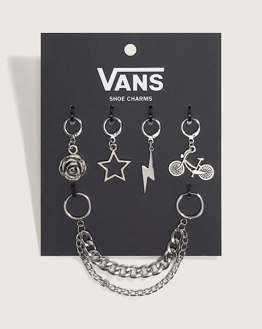 Style VN0010UE448 Silver shoe charms embellish every outfit from the ground up. Personalize any outfit with chains, metal roses, and lightning bolts that infuse your shoes with edge. Details - Shoe charm and chain set - 4 shoe charms with silver round clips and hardware - 1 double curb chain with one large link chain and one small link chain - Includes: rose charm, star charm, lightning bolt charm, bike charm and chain - Contains small parts. Not intended for children under 12 years old