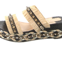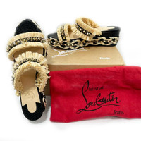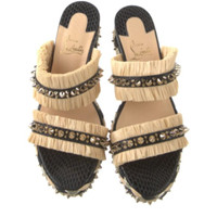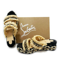 Gorgeous Christian Louboutin Voltinoudou Leather Slides. Worn once no signs of wear on the bottoms or in the soles. Gorgeous and comfortable wedge slides perfect for summer. * SIZE : 40 Fits more like a size 9 * Printed * Studded Accents & Raffia Trim * Platform * Includes Box & Dust Bag Designer Fit: This style typically runs a half size to a full size small. * Heels: 2.25" * Heels: 2.25" * Platforms: 1"