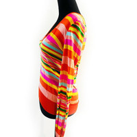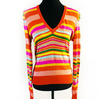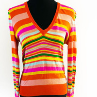 Beautiful Dolce & Gabbana rainbow striped soft and silky v-neck sweater blouse. Gorgeous colors are very light and can be worn all year round. There is a slight snag in the fabric, which can be fixed. I included an image of it: no fading or pilling. Beautiful sweater. Size: 42 (US 6) Measurements: Height 25 in Shoulders 17 in Flat Breast 17 in Flat waist 16 in Flat Material: 100% Viscose Condition: NOT NEW * Small snag size of a needle. PLEASE SEE IMAGE Color: No fading