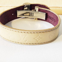 Great condition authentic Beige Louis Vuitton bracelet. I have the box and the dust cover. The leather is in good condition no stains to the leather. Color: Beige material: calf leather Inclusions: Box, Dustbag Dimensions: width: 2 in full length : 8.2