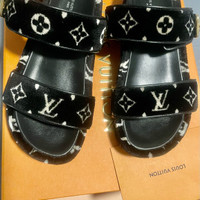 New tried on but not worn Authentic Louis Vuitton black velvet Jumbo sandals. black and white Monogram velvet with a soft, silky texture. The strap is adjusted with an engraved, gold-tone buckle. Size 39. Bought by me from Louis Vuitton in St Barts. Lowest price online for gorgeous comfy Authentic LV sandals. Comes with box two dust covers