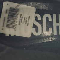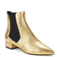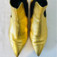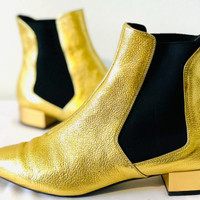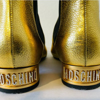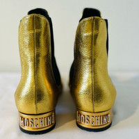 MOSCHINO Metallic Leather Chelsea Boots metallic leather and embellished with sparkling logo lettering at the heel, this pair is a glamorous take on Chelsea boots. * Metallic leather with textile gores * Point toe * Slip-on style * Leather lining * Padded insole * Leather sole * Made in Italy SIZE * Metallic heel, 1" (25mm) * Size 39: Fits True to size 8.5 to 9 In excellent condition Comes with Box