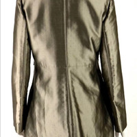 This is a coat by Valentino. It has long sleeves and a standing collar neckline. coat has an epaulet shoulder effect and features a pleated front around waist level. Features a belted detail with a logo gunmetal buckle and has a button and snap front closure. This coat is an Italian size 44, size 8. This Valentino metallic pewter wool blend button and snap front belted coat would be a classic addition to anyone's wardrobe! Belted closure Hardware: Gunmetal Origin: Made in Italy