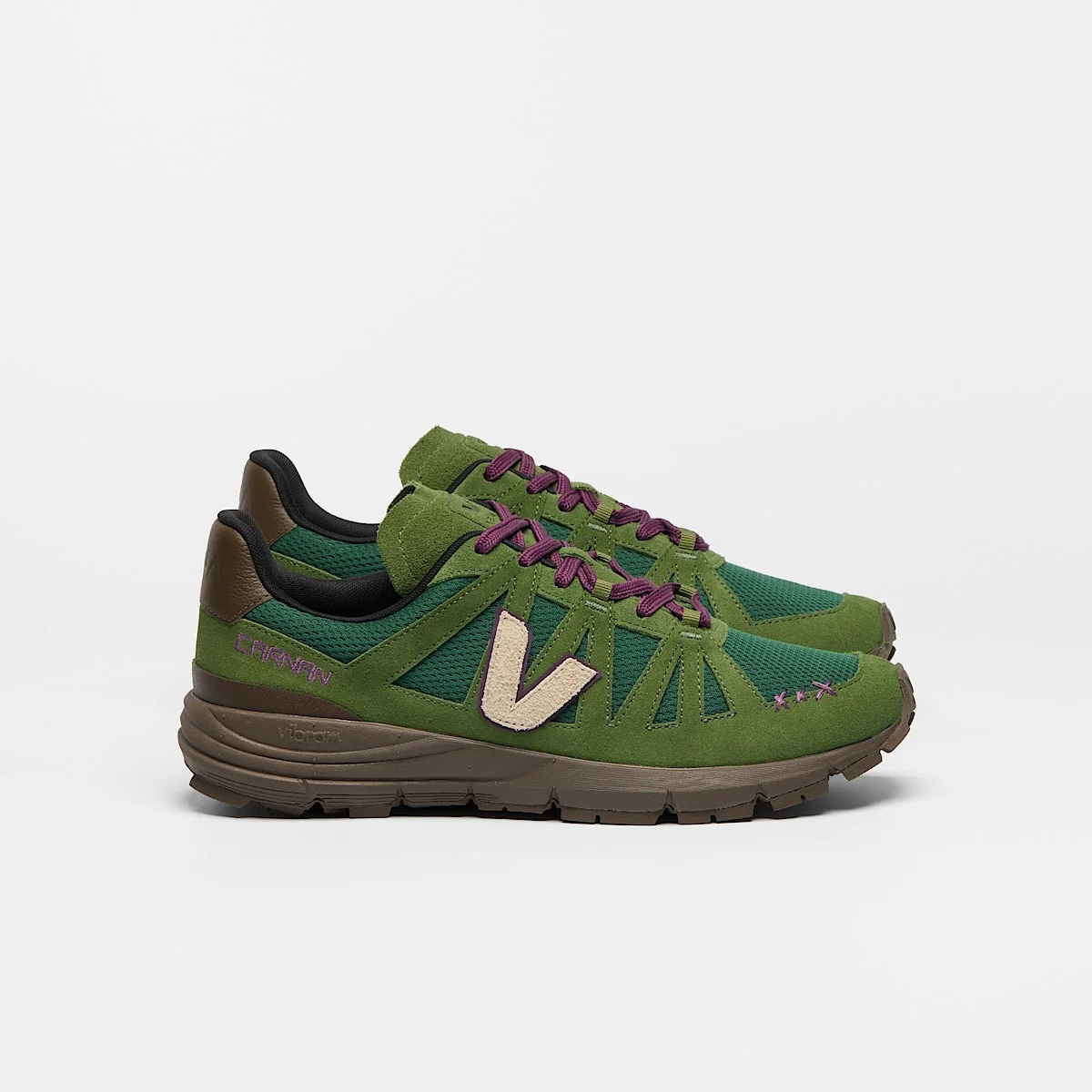 VEJA and Brazilian brand Carnan present a collaboration centered around the Salar, celebrating the richness of Brazilian nature. Sold with two pairs of laces, purple and brown. Upper: Alveomesh (100% recycled polyester) Panels: Suede and Organic Traced leather (O.T.) Insole: Amazonian rubber (13%), bio-based E.V.A. (65%, including 52% sugarcane), organic cotton (10%) and others (12%) Midsole: Bio-based E.V.A (61%, including 49% sugar cane), mineral carbonate (31%) and others (8%) Outsole: Amazonian rubber (30%), mineral silica (25%), synthetic rubber (24%) and others (21%). Made with Vibram Lining: Recycled polyester (100%) Laces: Recycled polyester (100%) Made in Brazil The Alveomesh is a technical fabric made out exclusively of recycled polyester. It brings breathability, flexibility and lightness to the shoe.