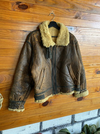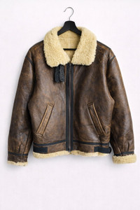 SKU RS136 ⸻ Era Late 1980s – 1990s (based on OPTI zipper, Japanese tags, and construction details) ⸻ Gender Men (can be worn unisex with a boxy or cropped fit) ⸻ Color • Exterior: Distressed Dark Brown • Lining: Natural Cream Shearling • Trim: Black leather piping ⸻ Founder Unknown STRATH CONAR is a heritage-style outerwear label rather than a designer-founded brand. ⸻ Brand Information STRATH CONAR • Known for heavy-duty leather and shearling outerwear • Emphasis on durability and cold-weather performance • Tagline: “Made from the best leather available” • Commonly produced for the Japanese market ⸻ Type of Garment B-3 Shearling Leather Flight Jacket (U.S. Army Air Forces–inspired aviator jacket) ⸻ Size • Tagged size: M • Fits like: Men’s Medium (B-3 jackets fit snug due to thick shearling lining) ⸻ Description This is an authentic B-3 shearling leather flight jacket by STRATH CONAR, inspired by WWII U.S. Army Air Forces aviation jackets. It features a heavy leather shell, full shearling lining, wide shearling collar, front zip closure with OPTI zipper, reinforced seam piping, and adjustable waist tabs. The leather shows strong vintage aging with natural patina, surface wear, and scuffing—hallmarks of genuine B-3 jackets. The shearling interior remains thick and warm, making this jacket both functional and collectible. ⸻ Tips of Style • Best paired with raw denim or military trousers • Wear with engineer, combat, or service boots • Layer over a thermal or heavy knit • Perfect for vintage military, aviator, biker, or workwear styles ⸻ Rating (1–10) 8 / 10 ⸻ Condition Good Vintage Condition • Heavy patina and visible wear on leather • No major structural damage • Zipper works properly • Shearling intact and warm • Wear is cosmetic and adds character ⸻ Conclusion A true B-3 shearling flight jacket with authentic vintage appeal. This STRATH CONAR piece delivers classic military styling, real warmth, and desirable aging. Ideal for collectors or everyday wearers who appreciate heritage aviation jackets with character.