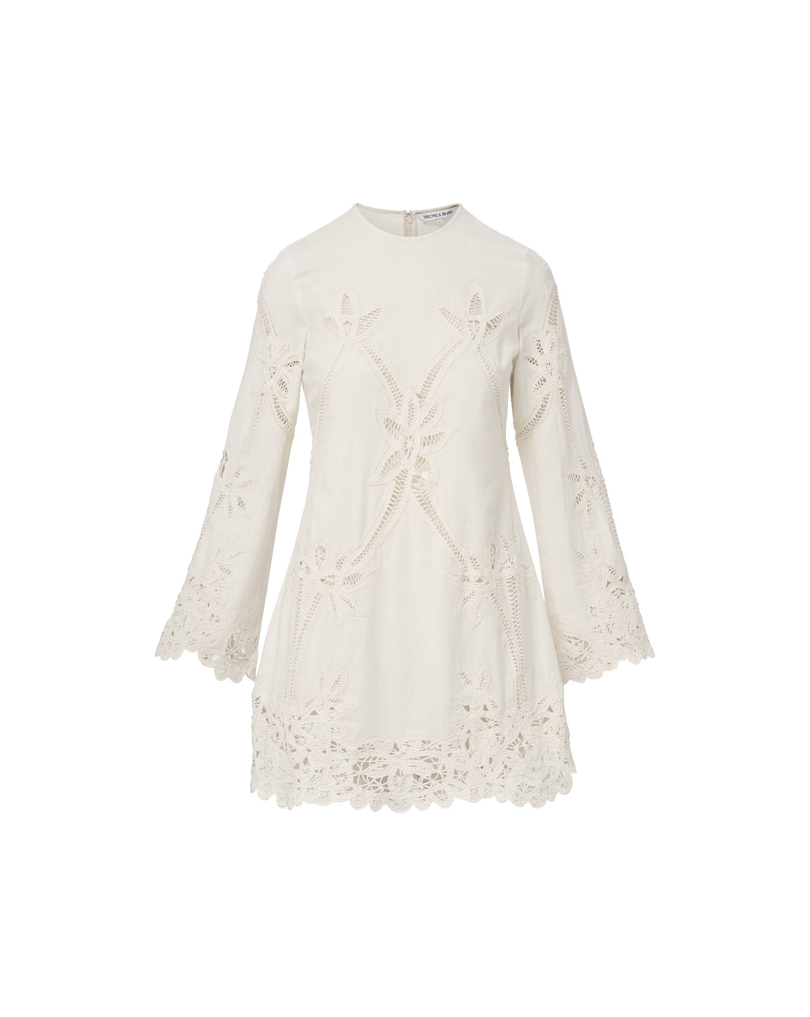 Product details A go-to for your next getaway. Crafted from a lightweight cotton-linen blend in off-white, the Amberg shift dress is defined by intricate floral Battenberg lace details throughout, finished with scalloped edges for added romance. A hidden back zip closure and built-in mini slip provide ease and versatility. This long-sleeve mini dress pairs perfectly with a strappy flat sandal or sleek kitten heel. - 75% Cotton, 25% Linen - Lining: 100% Cotton - Dry clean only - Style #2511EM10421991
