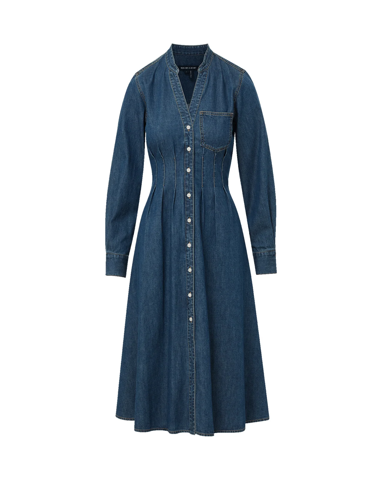 Product details The denim dress—perfected. Crafted from 100% premium cotton in a classic medium-blue wash, the Arcadia features a midi-length A-line silhouette with elongated seam details to define the waist. A collarless split V-neckline extends into a button-front placket, finished with a single front pocket and wide-cuffed sleeves. Pair with tall boots or slingback heels for a polished finish. - 100% Cotton - Machine wash cold - Style #J25127100193C9