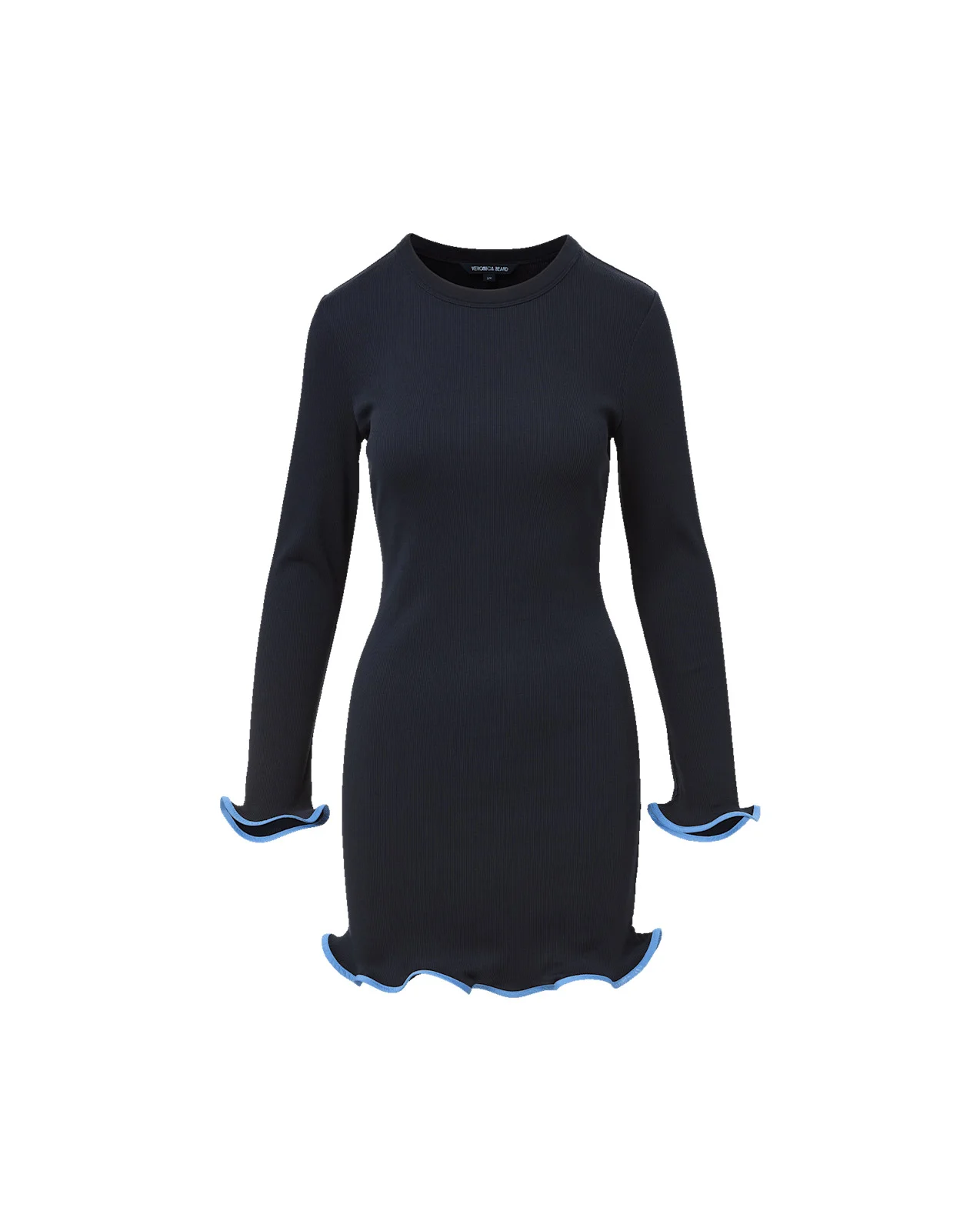 Product details An everyday staple—with a flirty twist. Crafted from softly ribbed stretch cotton in navy, the Baranova mini dress features a slim, body-skimming fit with lettuce-edge ruffles at the cuffs and hem. A clean crew neckline, long sleeves, and contrasting blue piping complete the look. Perfect from day to date night—pair it with flats, sneakers, or heels. - 96% Cotton, 4% Elastane - Turn inside out and machine wash cold. Lay flat to dry. - Style #J2512JY15221960