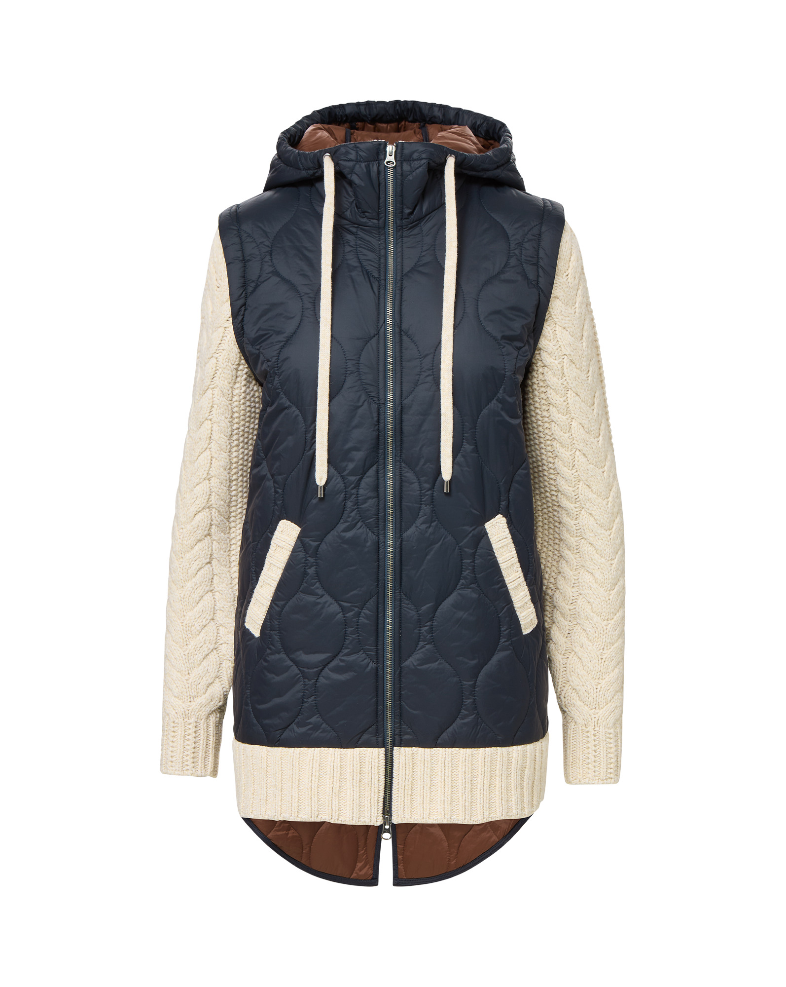 Product details Two-for-one style. The Barrows jacket pairs a quilted body with wool-blend cable-knit sleeves for striking contrast, giving you the best of both worlds: the warmth of a coat and the comfort of your favorite sweater. Featuring a quilted hood, elongated back hem, and contrasting ribbed trim and patch pockets, it’s as functional as it is chic—all you have to do is zip up and go. - 100% Nylon Body; 80% Wool, 20% Polyamide Sleeves - Dry clean only - Style #2508KA2211333