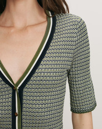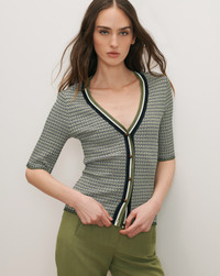 Product details Designed to flatter, the Calliope quarter-sleeve top is tailored for a slim, body-hugging fit. Crafted in a textured micro chevron knit with a subtle sheen, it features a deep V-neckline that flows into a button-front placket. A wide contrast striped trim adds dimension. Style this green and navy top with dark-wash denim and sneakers for an elevated daytime look. - 100% Rayon - Dry clean only - Style #2603KS1490339