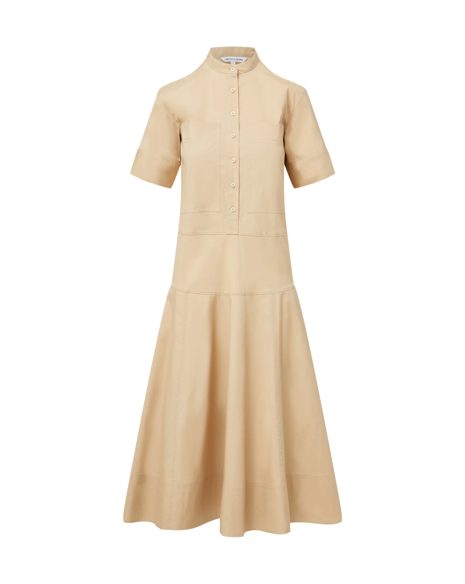 Product details Precision tailoring in an effortless summer dress. Expertly tailored from crisp cotton with stretch, the Cam midi dress—in versatile khaki—is a study in modern minimalism. The boxy button-down top features half sleeves, a high jewel neckline, and oversized patch pockets while the flared, drop-waist skirt adds a touch of femininity. Pair with sneakers or flat sandals for one-and-done ease. - 97% Cotton, 3% Elastane - Unlined - Closure: Buttons - Dry clean only - Style #2506SCP21798