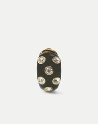 Product details Small in size, big on shine. Crafted from 14k gold-plated brass, this statement huggie hoop is coated in glossy black enamel and adorned with allover crystals. Finished with a click-top closure for ease, it's the perfect piece to elevate the everyday. - 14k Gold-Plated Brass, Enamel Epoxy - Stone: Glass - Length 0.7” - Gently wipe the surface with a soft cloth to clean. Avoid direct contact with lotions, perfumes, or oils. - Style #96-E0009