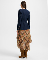 Product details A refined take on the denim jacket. Expertly crafted from a premium stretch-denim blend, Cynthia is a single-breasted blazer featuring a darted bodice and angled hem that define the waist. A collarless V-neckline, front-flap pockets, and buttoned sleeves complete the look. Edgy yet polished, style it with a slim pant and heels for a sleek finish. - 75% Cotton, 23% Polyester, 2% Elastane - Lining: 100% Cupro - Dry clean only - Style #2508NV2611384