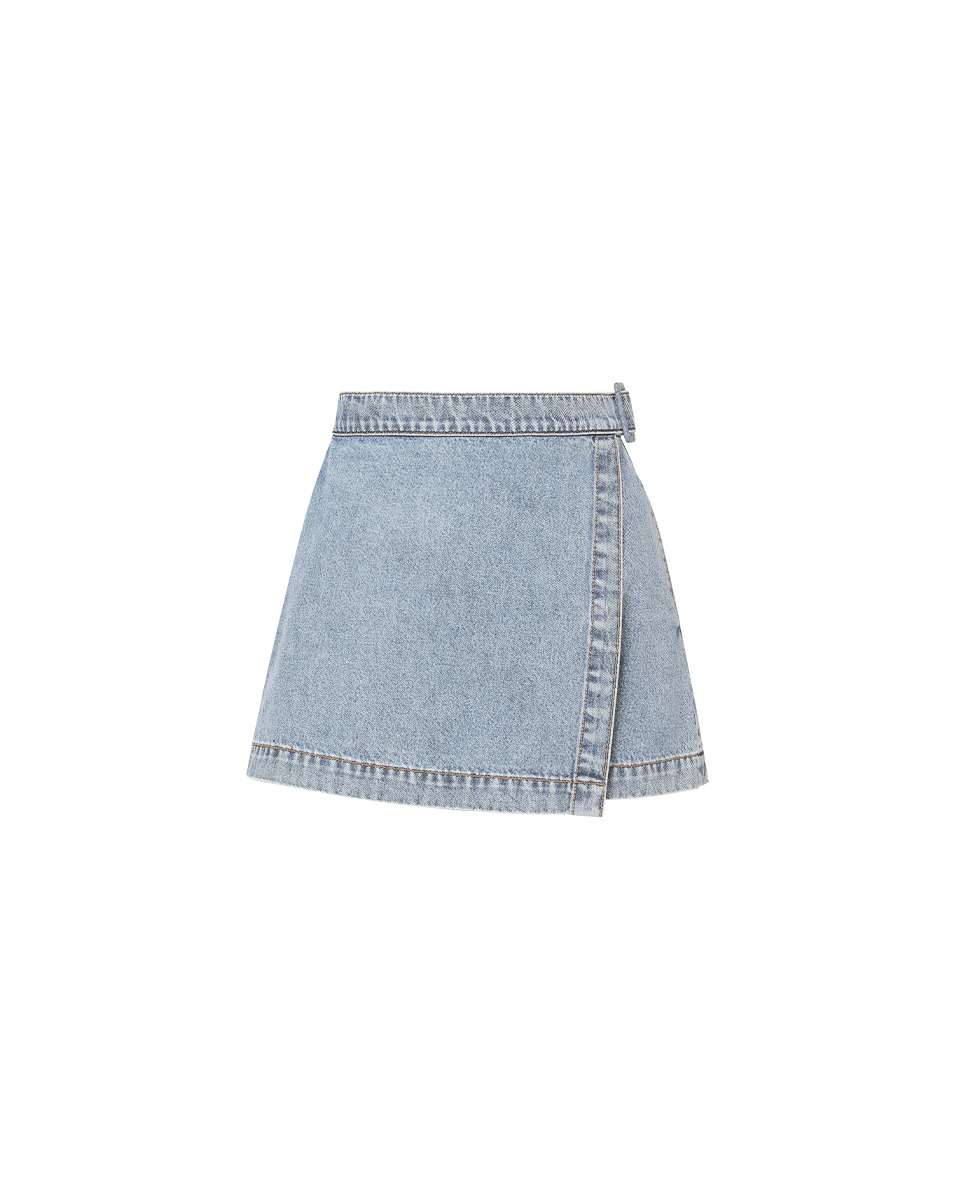 Product details Skirt from the front, shorts from the back. Made from premium non-stretch Japanese denim, the Diaz skort features a wrap-style A-line mini skirt—secured with a matching side buckle—and welt pockets in the back. It offers perfect comfort, coverage, and style. Perfect for weekends and wanderlust, this chic must-have is easily dressed up or down. - 100% Cotton - Fabric country of origin: Japan - Turn inside out and machine wash cold. Hang to dry. - Style #J25051681284VW