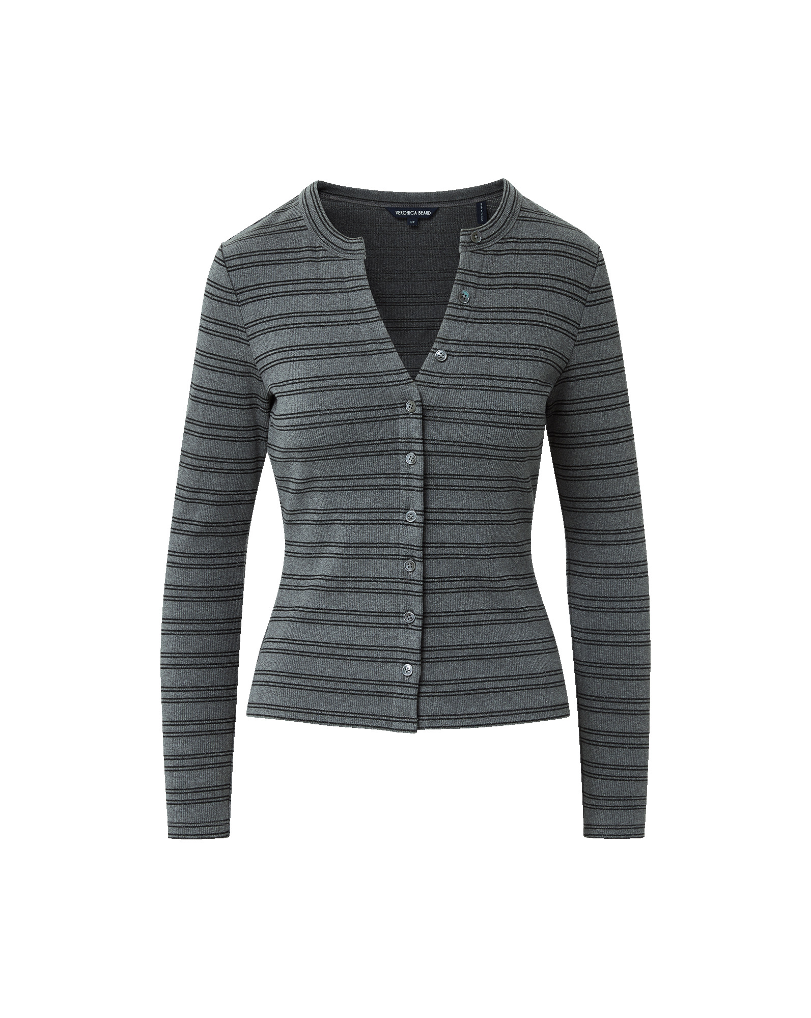 Product details A staple piece in any wardrobe. The long-sleeve Dilia is crafted from premium stretch cotton in grey and black stripes with a hint of shine. A split crew neckline, black pearlized buttons, and soft ribbing add texture and dimension. Wear it with denim for an effortless everyday look or tuck it into tailored trousers for a polished finish. - 90% Cotton, 4% Metallic fiber, 4% Polyamide, 2% Elastane - Machine wash cold - Style #J2510JY193T0600