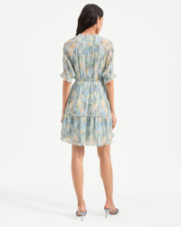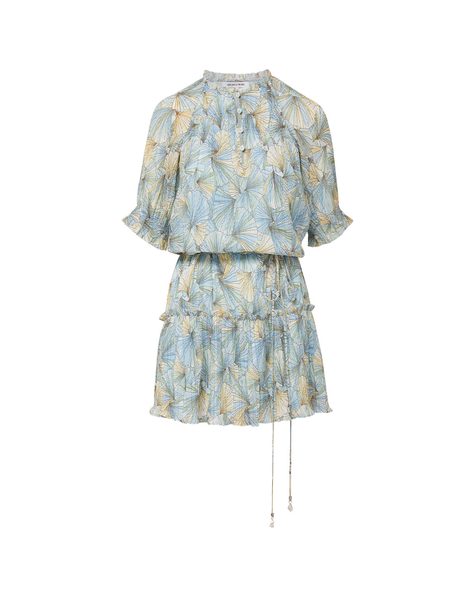 Product details The ultimate in feminine ease. Made from a premium stretch fabrication, the Dorrie mini dress features a tiered skirt, delicate allover pleating, and a custom painted shell pattern in pale blue and yellow. Romantic details include shirring at the cuffs and tight ruffles at the neckline and skirt. A thin sash, with faux baroque-pearl charms, lets you define the waist or wear it relaxed. Dress it down with sneakers or up with kitten-heel sandals. - 100% Polyester - Lining: 100% Polyester - Dry clean only - Style #2505CF1421911