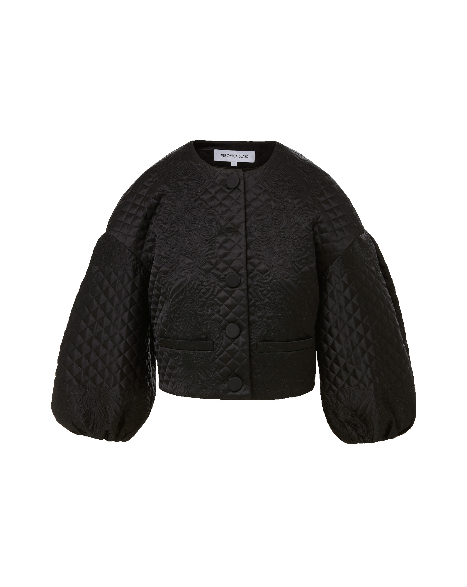 Product details A jacket that makes an entrance. Crafted from smooth, subtly lustrous tailoring fabric, the Drake jacket is defined by intricate allover diamond-and-floral quilting. Voluminous balloon sleeves balance its cropped, collarless silhouette for dramatic effect. Front welt pockets and self-covered buttons complete the look. Style with a slim, black pant for an elegant, modern finish. - 100% Polyester - Dry clean only - Style #2511NV6711458