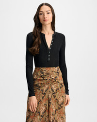 Product details A foundational piece you’ll reach for again and again. The Drexler henley long-sleeve shirt is crafted from a delicate, semi-sheer stretch rib knit that softly hugs the body for a slim, flattering fit. A satin-trimmed deep V-neckline and placket add subtle contrast and shine, finished with stone snaps for a modern touch. Tuck into your favorite VB denim for polished ease. - 96% Polyester, 4% Elastane - Turn inside out and machine wash on cold - Style #J2508JY157T0492