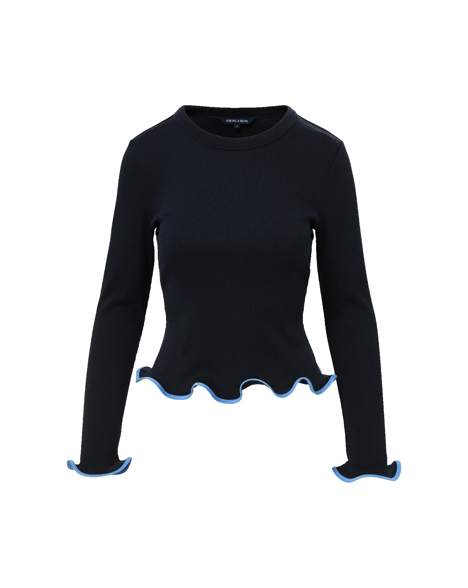 Product details An everyday staple—with a flirty twist. Crafted from softly ribbed stretch cotton in navy, the Elianne long-sleeve T-shirt features a slim fit with lettuce-edge ruffles at the cuffs and hem. A clean crew neckline and contrasting blue piping complete the look. Pair with your favorite VB denim and sneakers to elevate the everyday. - 96% Cotton, 4% Elastane - Turn inside out and machine wash cold. Lay flat to dry. - Style #J2512JY152T0607
