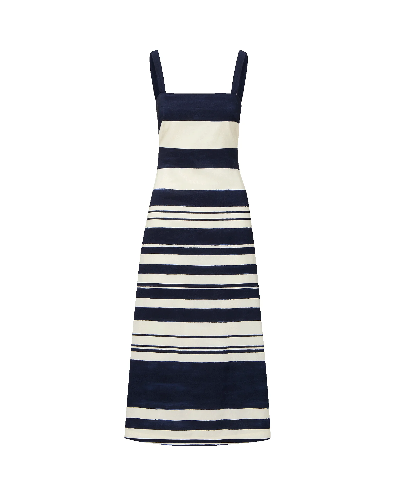 Product details The essential spring dress. Crafted from a crisp linen blend, the Ella midi dress is cut in slim A-line silhouette and features navy-and-white stripes with a hand-painted look. Wide, adjustable shoulder straps are finished with shell buttons for subtle dimension. Perfect for date nights and weekends around town—just add a sandal and go. - 55% Linen, 42% Viscose, 3% Elastane - Lining: 100% Cotton - Closure: Back zip - Dry clean only - Style #2603LN3221406