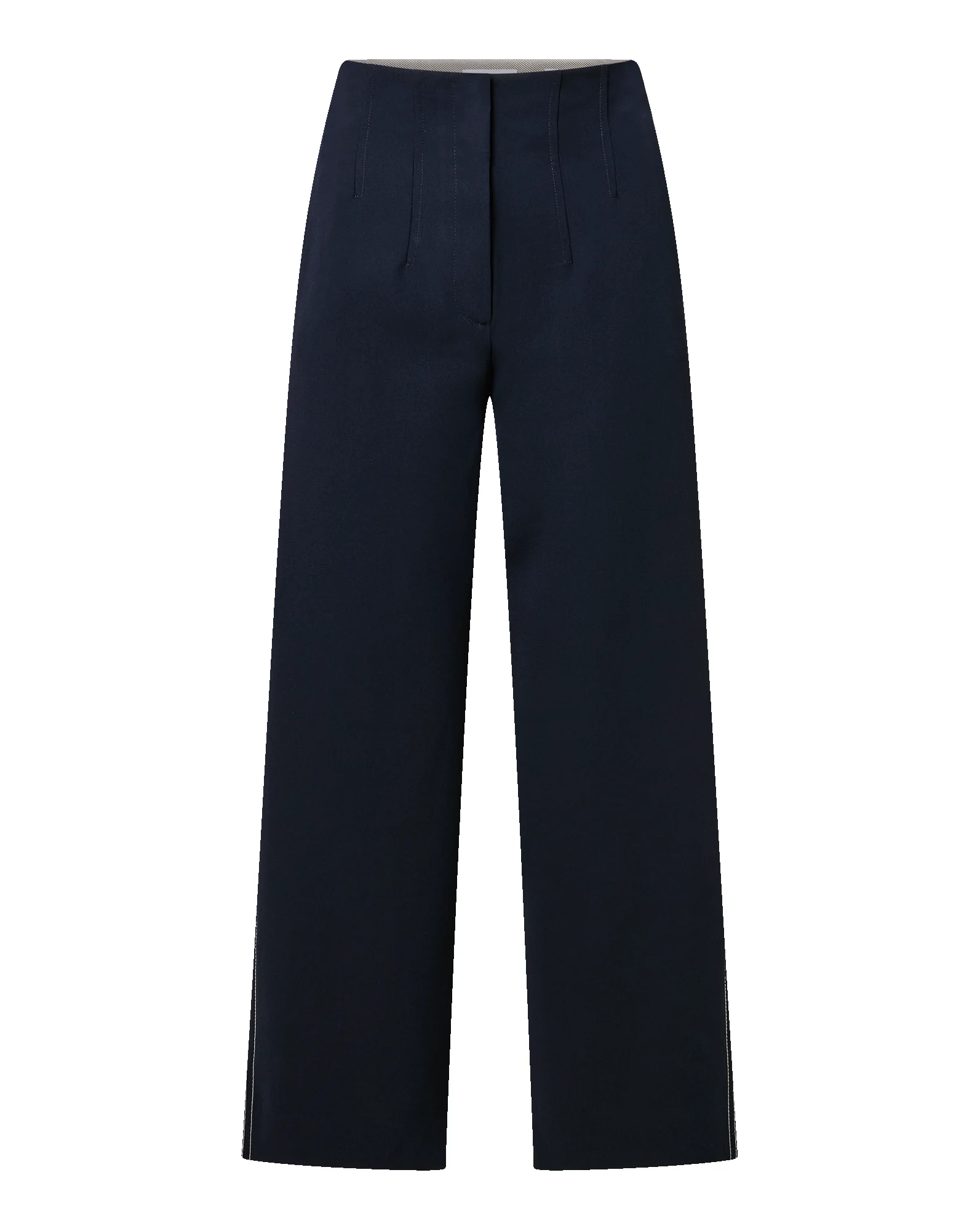 Product details A sophisticated trouser, designed to flatter. Expertly tailored to hug the waist, the Ellin features a cropped wide-leg silhouette with a Hollywood waistband, detailed with darting at the front for a cinched effect. Contrast topstitching along the sides finishes the look, adding subtle definition. Pair with the Nevis Jacket for a polished, suited look—or keep it casual with a classic white tee. - 100% Polyester - Lining: 100% Polyester - Made in USA - Closure: TKCoil zipper at CF with hook & bar closure at waistband.TK - Dry clean only (no trichloroethylene). Iron on low. - Style #2507SU8860833