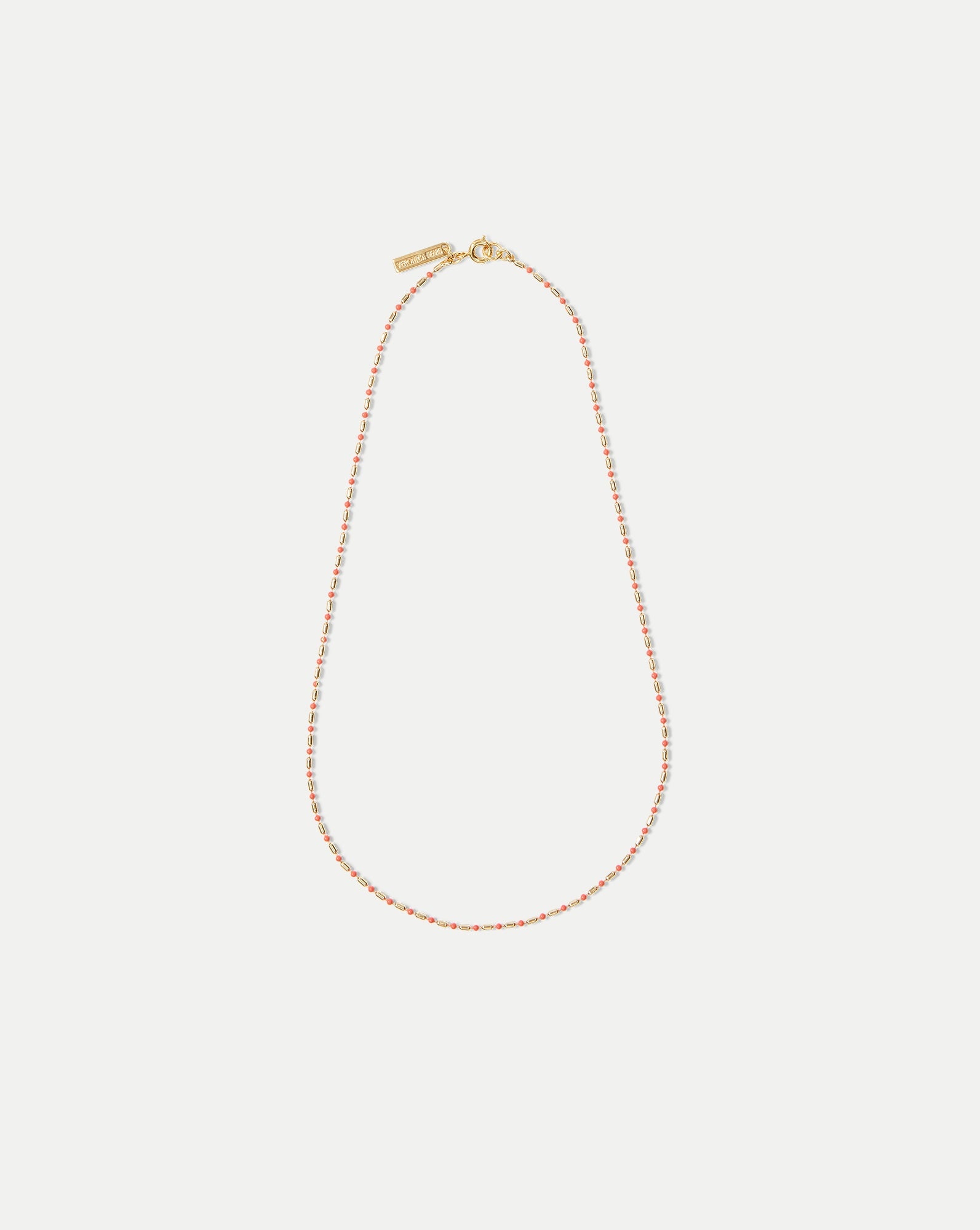 Product details The effortless everyday necklace, made for layering. This dainty, 16-inch chain features a mix of 12-karat gold-plated brass and pink enamel-covered beads, securing with a Q clasp for ease. Layer with the Long Enamel Bead Chain Necklace (or two, or three), mixing and matching colors, and style with your favorite VB tees, tank tops, and swimwear. - Details: 12k Gold-Plated Brass, Enamel - Length 16” - Gently wipe surface with a soft cloth to clean. Avoid direct contact with lotions, perfumes, or oils. - Style #96-N0001