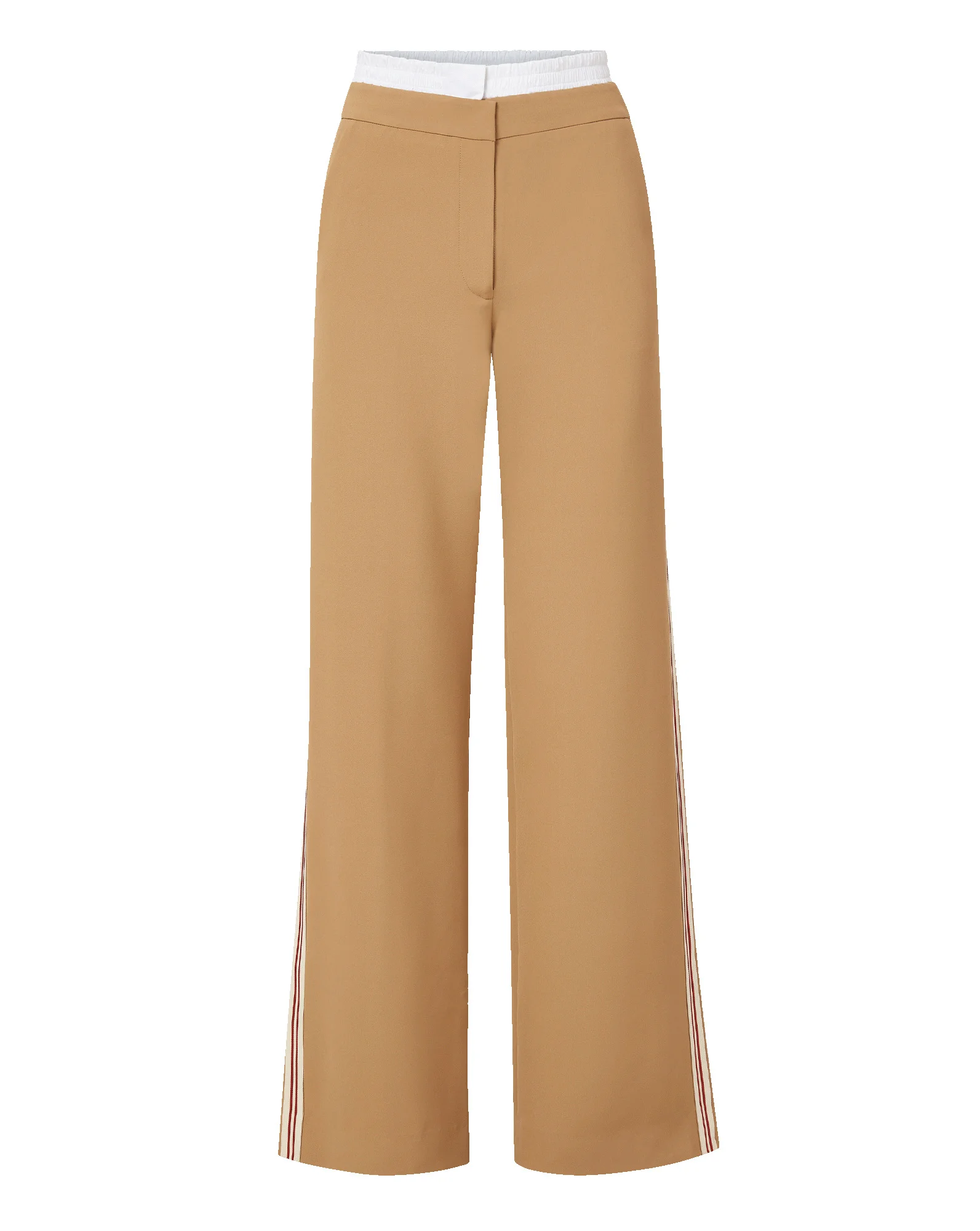 Product details Part trouser, part track pant. Cut from premium stretch crepe in khaki, the Eugene features a high-rise, wide-leg silhouette, defined by sporty side stripes and a boxer double waistband detail. Angled side pockets and a flat hook-and-bar closure complete the look. A refined take on a casual classic, dress it up with a blazer or style with a simple knit to elevate the everyday. - 97% Polyester, 3% Elastane - Lining: 100% Polyester - Dry clean only - Style #2512CP3260838