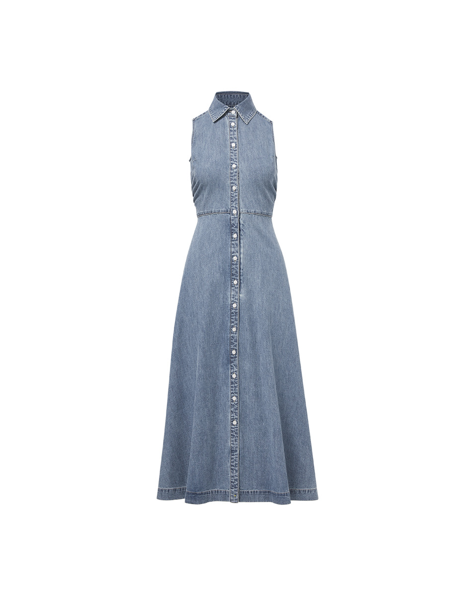 Product details Equal parts polished and effortless, Fuller is the easy midi dress you'll reach for again and again, crafted from soft, lightweight denim in classic blue. This collared, button-down dress features a darted bust and ruched waist, falling to a full, flowing skirt to create an ultra-flattering A-line silhouette. Pair it with ballet flats or strappy sandals for a chic spring look. - Details: 100% Cotton - Unlined - Machine wash cold with like colors - Style #J25047100134GC
