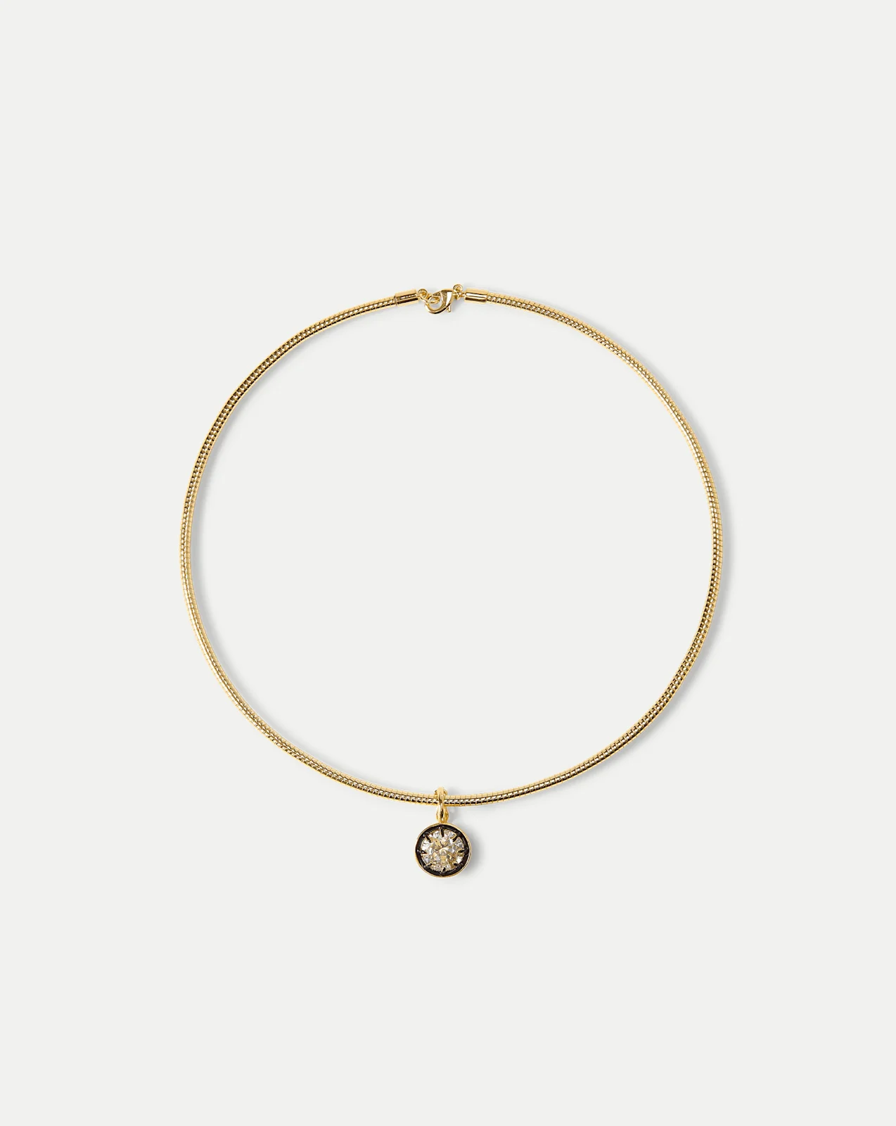 Product details Equal parts polished and cool. Falling just below the collarbone, this snake chain necklace is crafted from 14-karat gold-plated brass and features a round crystal pendant set in a contrasting black enamel multi-prong frame. A secure barrel clasp ensures easy wear. A versatile favorite, it transitions seamlessly from daytime dressing to night-out looks. - 14k Gold-Plated Brass - Stone: Glass - Length 17” - Gently wipe the surface with a soft cloth to clean. Avoid direct contact with lotions, perfumes, or oils. - Style #96-N0012