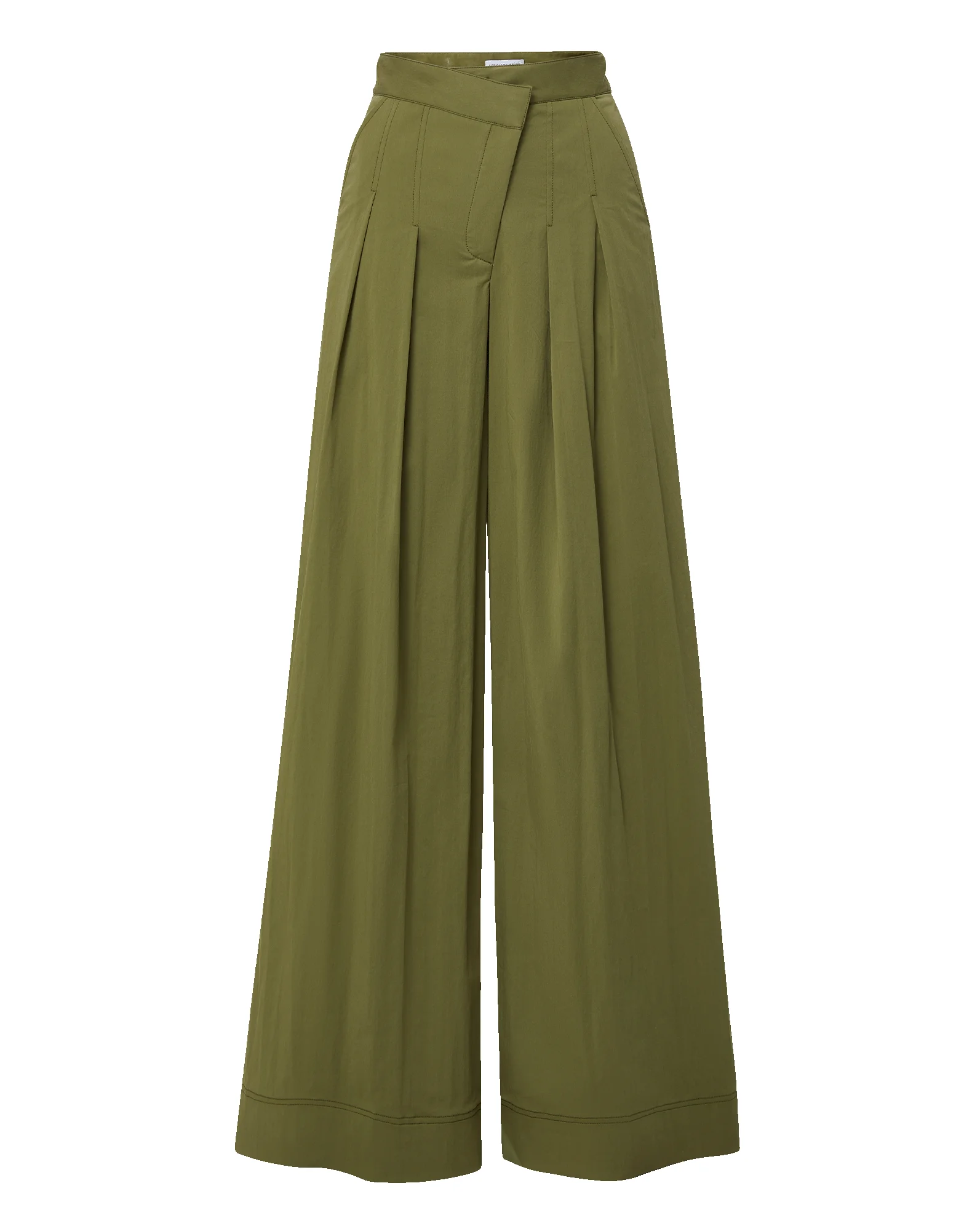 Product details A modern take on the tailored trouser. Crafted from stretch cotton in army green, the Heron pant is defined by a high-waisted, crossover waistband and extra-wide-leg silhouette. Dramatic double pleats and topstitched seam details add dimension, while front slash and back welt pockets offer function. Tuck in a classic button down or pair with a simple tee—it dresses up or down with ease. - 68% Cotton, 27% Polyamide, 5% Elastane - Lining: 100% Cotton - Made in the USA from Turkish Cotton blend - Dry clean only - Style #2603SU03661149