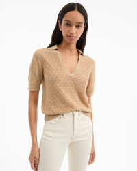 Product details Spun from soft stretch linen, the Issa top is a refined twist on the classic polo shirt. Available in black and khaki, it features flattering half sleeves, a collared V-neck, and a subtle tone-on-tone knit pattern. The ultimate in versatility, this pairs well with anything and everything—jeans, shorts, maxi skirts, minis, and more. - 83% Linen, 17% Polyamide - Dry clean only - Style #2505KL2290779