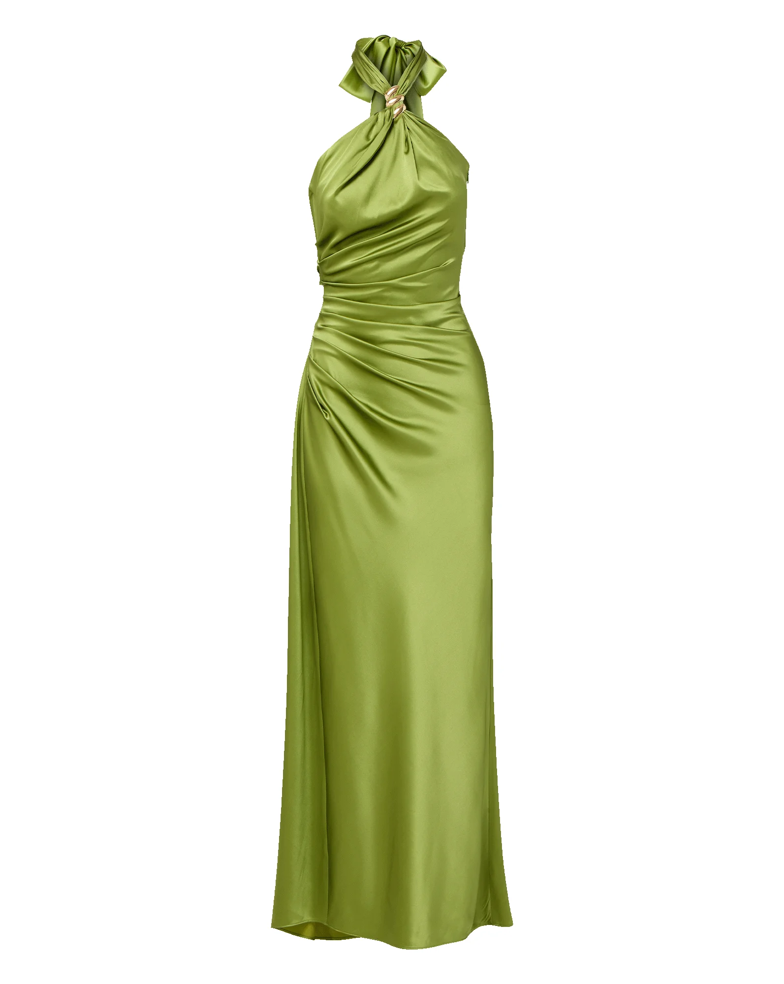 Product details RSVP-ready, in vibrant chartreuse green. Made from lustrous silk satin, the Izaren maxi dress features a dramatic halter silhouette that skims the body while side ruching and stretch ensure a flattering fit. Gold metal hardware accents the neckline, and an extra-long self-tie in the back doubles as its own design detail. Style with gold jewelry and heels to play off the metallic touches. - 53% Silk, 35% Viscose, 12% Elastane - Lining: 100% Polyester - Closure: Side zip and hook-and-eye - Dry clean only, with metal loop covered - Style #2603FL5022533