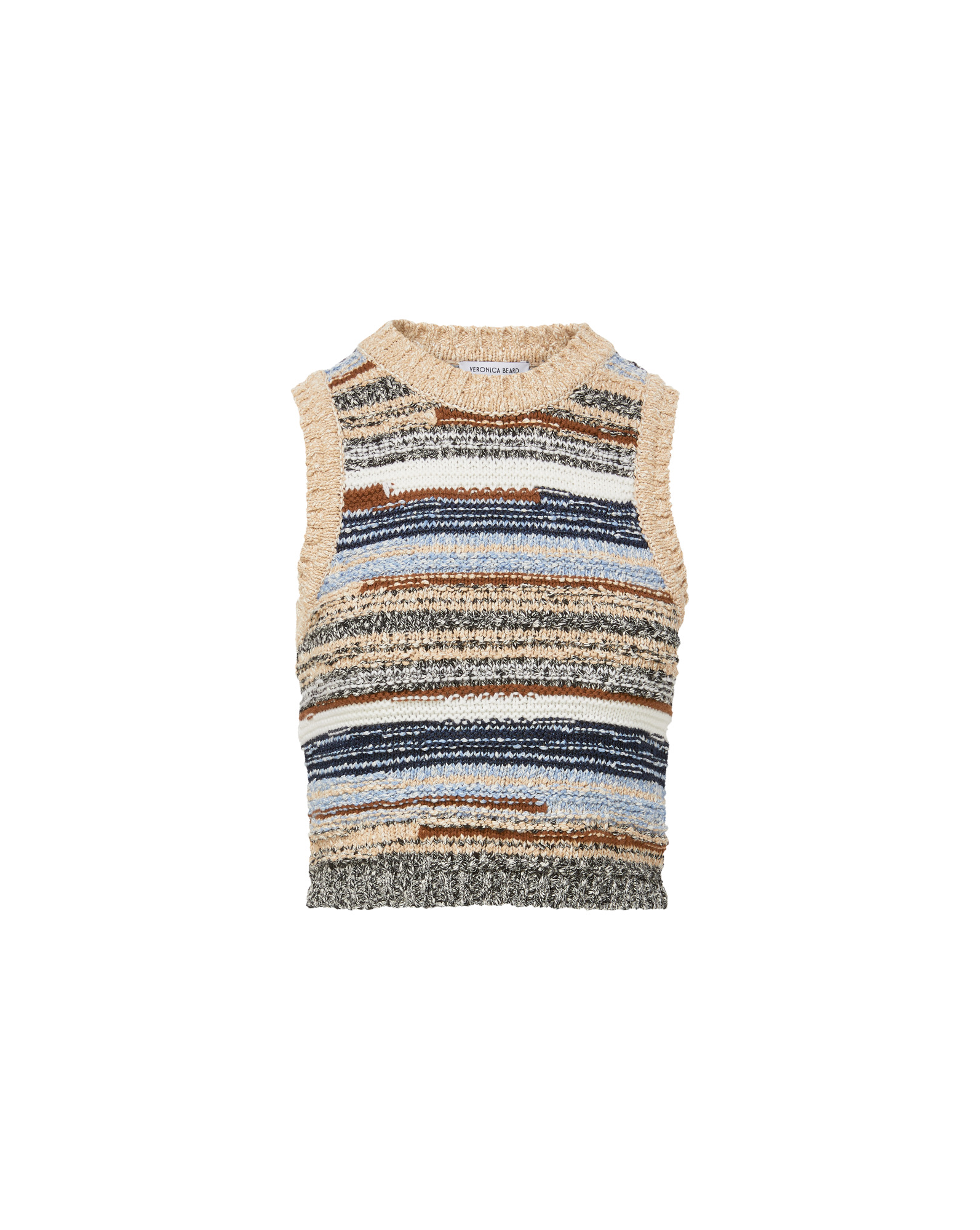 Product details A fresh take on our favorite tank. Spun from a blend of premium cotton and wool, our cropped Jerrel top features an abstract striped pattern in blue and brown hues—striking yet neutral enough for effortless styling. Wide ribbed trimming at the crew neckline and hems complete the look. Wear this knit tank top solo or as a versatile layering piece. - Mixed Yarns: 100% Cotton, 100% Merino Wool, 100% Polyester - Fabric country of origin: Italy - Dry clean only - Style #2507KC4590605