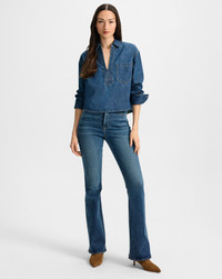 Product details Our endlessly versatile Khai shirt, reimagined in denim. Expertly tailored from premium cotton, it features a relaxed, long-sleeve silhouette with a rounded, cropped hem. A neat collar, a split V-neck, and a single patch pocket offer a softer, more refined take on the classic denim button-down. Pair with matching denim for a cohesive look, or brown leather pants for a rich, contrasting finish. - 100% Cotton - Machine wash cold - Style #J25087104071BB