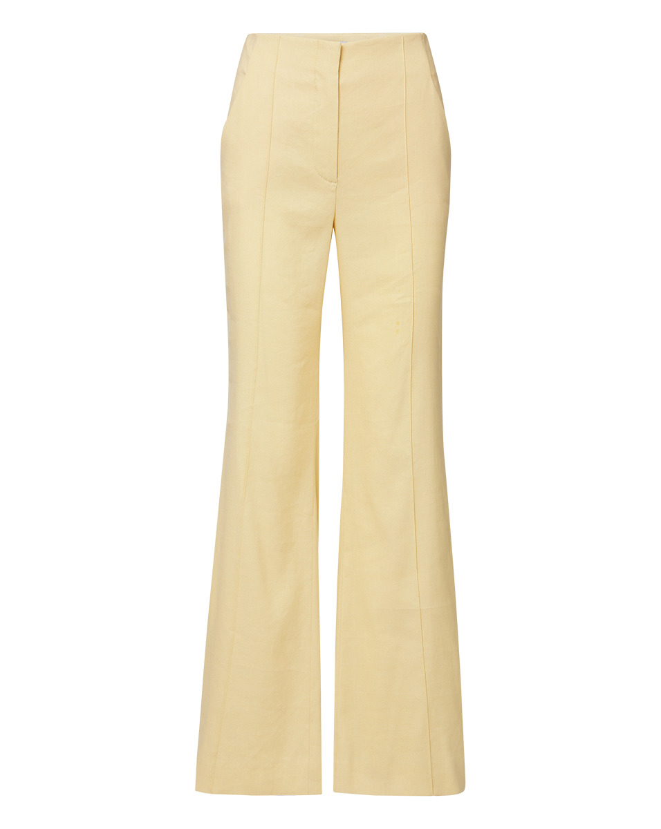 Product details Expertly tailored from Italian stretch linen, the Komi is defined by a fluid wide-leg silhouette. Equal parts relaxed and refined, this standout butter yellow style features a high waist and pressed creasing down the front for an elongating effect. Wear with the coordinating Miller dickey jacket for memorable matching-set moment. - 55% Linen, 44% Viscose, 1% Elastane - Lining: 100% Polyester - Fabric country of origin: Italy - Dry clean only - Style #2505LN3360306