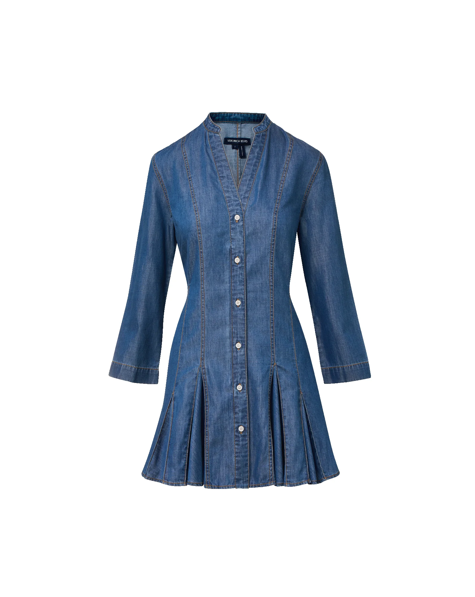 Product details A feminine take on the denim dress. Made from soft chambray—with stretch for ease—the long-sleeve Korinda mini shirtdress is defined by a swingy godet skirt for added volume and movement. In a classic blue wash, it also features a deep-V neckline, top-stitched panels, and a button-down front. Endlessly versatile, this pairs well with sneakers, sandals, and heels alike. - 60% Cotton, 40% Lyocell - Turn inside out and machine wash cold. Tumble dry on low. - Style #J26027010205P8