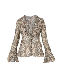 Product details A boho take on the button-down. Crafted from 100% silk with an all-over paisley print, Kyrie is a light and airy bias-cut blouse defined by a ruffled V-neckline and sheer bell sleeves. Floral shell buttons down the front complete the look. Style with your favorite VB denim to elevate the everyday. - 100% Silk - Lining: 100% Polyester - Dry clean only - Style #2508GG6641308