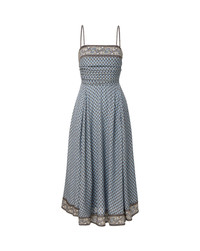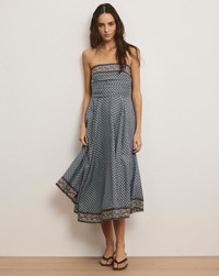 Product details A breezy dress to carry you from day to night. The Lana midi is crafted from a lightweight, textured cotton blend in a blue scarf–inspired pattern, framed with a paisley border at the trim and hem. Removable spaghetti straps allow versatile styling, while smocked back paneling and soft folds along the bodice ensure a flattering fit. Perfect for beach dinners or city strolls—just add a sandal and go. - 70% Viscose, 30% Cotton - Lining: 100% Cotton - Dry clean only - Style #2602VO2821727