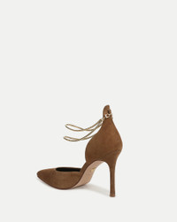 Product details A classic silhouette—with a luxe new detail. Crafted from premium tan suede, the Leandra d'Orsay pump features a pointed toe and is set on a tall stiletto heel. Double gold chains wrap around the ankle, adding dimension and glamour. The perfect finishing touch for any evening look, style it with tailored pants, a dress, or a skirt. - Suede - Lining: Leather - Heel Height: 3.75” - Store in a cool, dry place inside a dust bag - Clean under the supervision of a specialist - Style #J7120L1200
