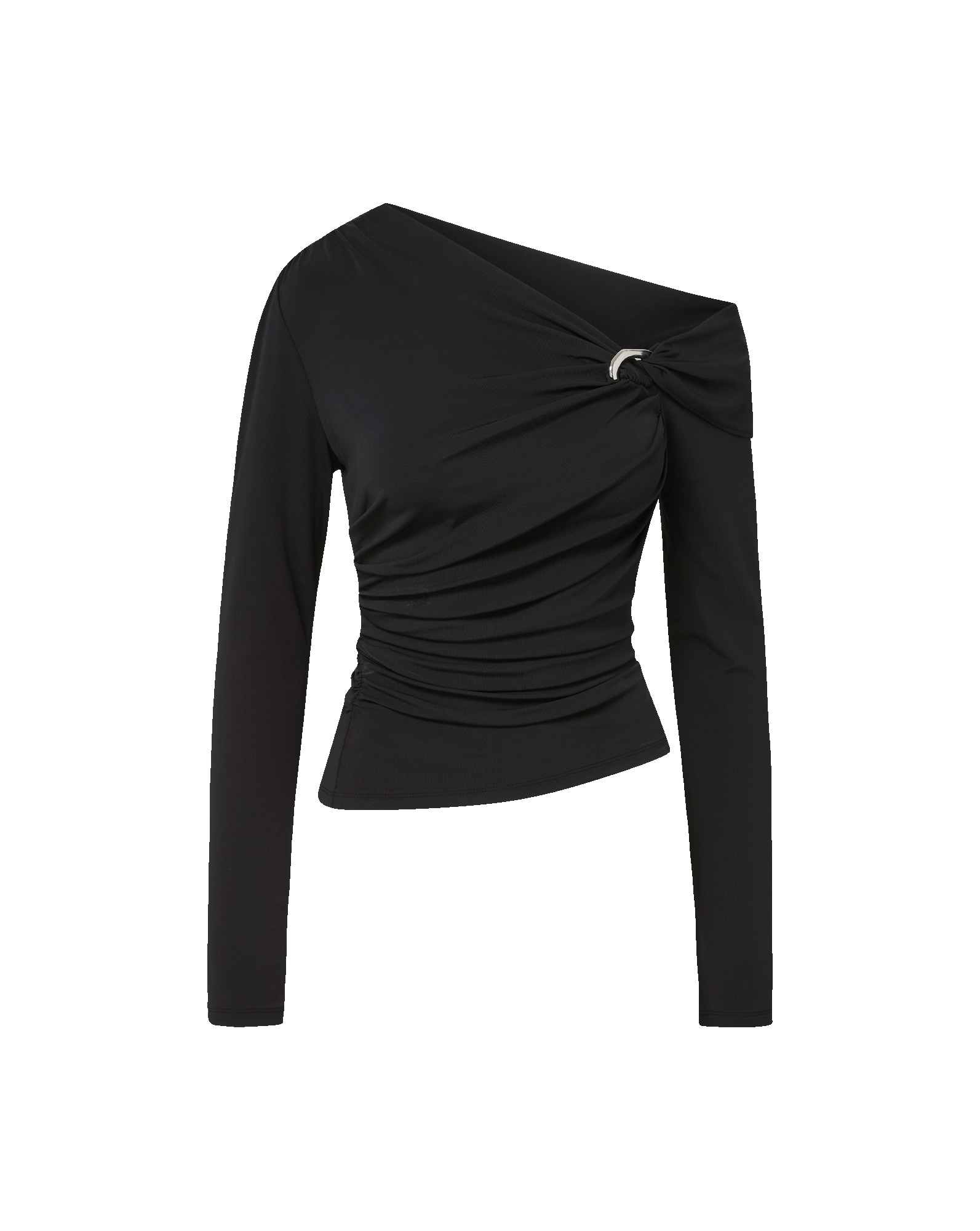 Product details A modern take on a wardrobe essential. Crafted from black stretch jersey, the Lozea long-sleeve top is cut for a body-skimming fit with asymmetric draping and ruching throughout. A folded, off-one-shoulder neckline is secured with silver-tone hardware for a cool edge. Both a staple and a statement, pair it with denim by day or a sleek mini skirt after dark. - 95% Viscose, 5% Elastane - Hand wash cold - Style #2511JY19641483