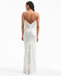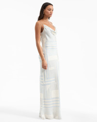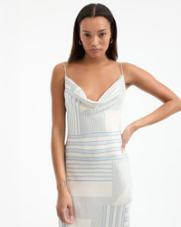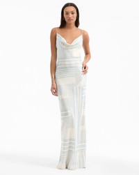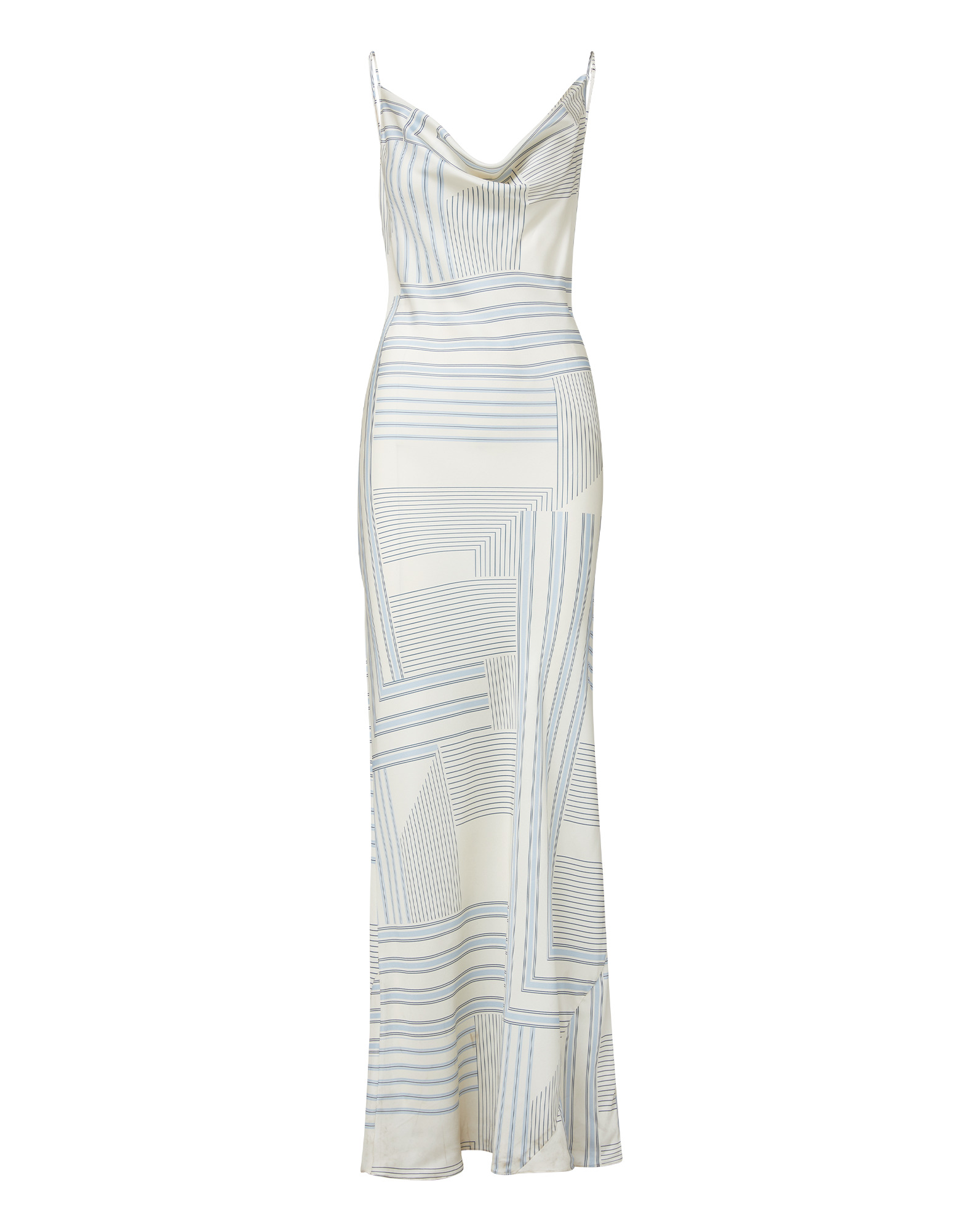 Product details Nineties nostalgia meets modern chic. Expertly made from premium stretch silk, the Madison maxi dress contrasts a clean, streamlined slip silhouette with a bold geometric print in white and ice blue. Finished with spaghetti straps and a draped cowl neck, it's perfect for date night or your next big event. Just pair with stilettos and a clutch. - 53% Silk, 47% Viscose - Lining: 100% Polyester - Dry clean only - Style #2507FL3721445