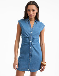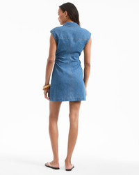 Product details A denim dress, with a VB twist. Expertly tailored from 100% cotton, the Maura button-down dress is defined by front and side ruching for a defined waist. Darting at the bust allows for a superior fit while cap sleeves, a collared V-neck, and opalescent buttons complete the look. Pair this minidress with flats for day or dress it up with neutral strappy stilettos. - 100% Cotton - Unlined - Closure: Snap buttons, a hidden front zip and a hook-and-eye closure - Turn inside out and machine wash cold. Tumble dry on low. Color transfer may occur. - Style #J25067100083SY