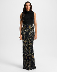 Product details A high-shine take on a '90s-inspired silhouette. Crafted from black sheer georgette, the Medina slip skirt features an intricately embellished gold metallic floral pattern, hand-beaded in India. Cut on the bias for fluid, body-skimming drape, it hugs the hips and falls to a floor-sweeping maxi length, creating a flattering, elongating shape. A true statement piece, pair it with a simple cami for a sleek, dress-up look. - 100% Polyester - Lining: 100% Polyester - Spot clean only - Style #2510EM9230363