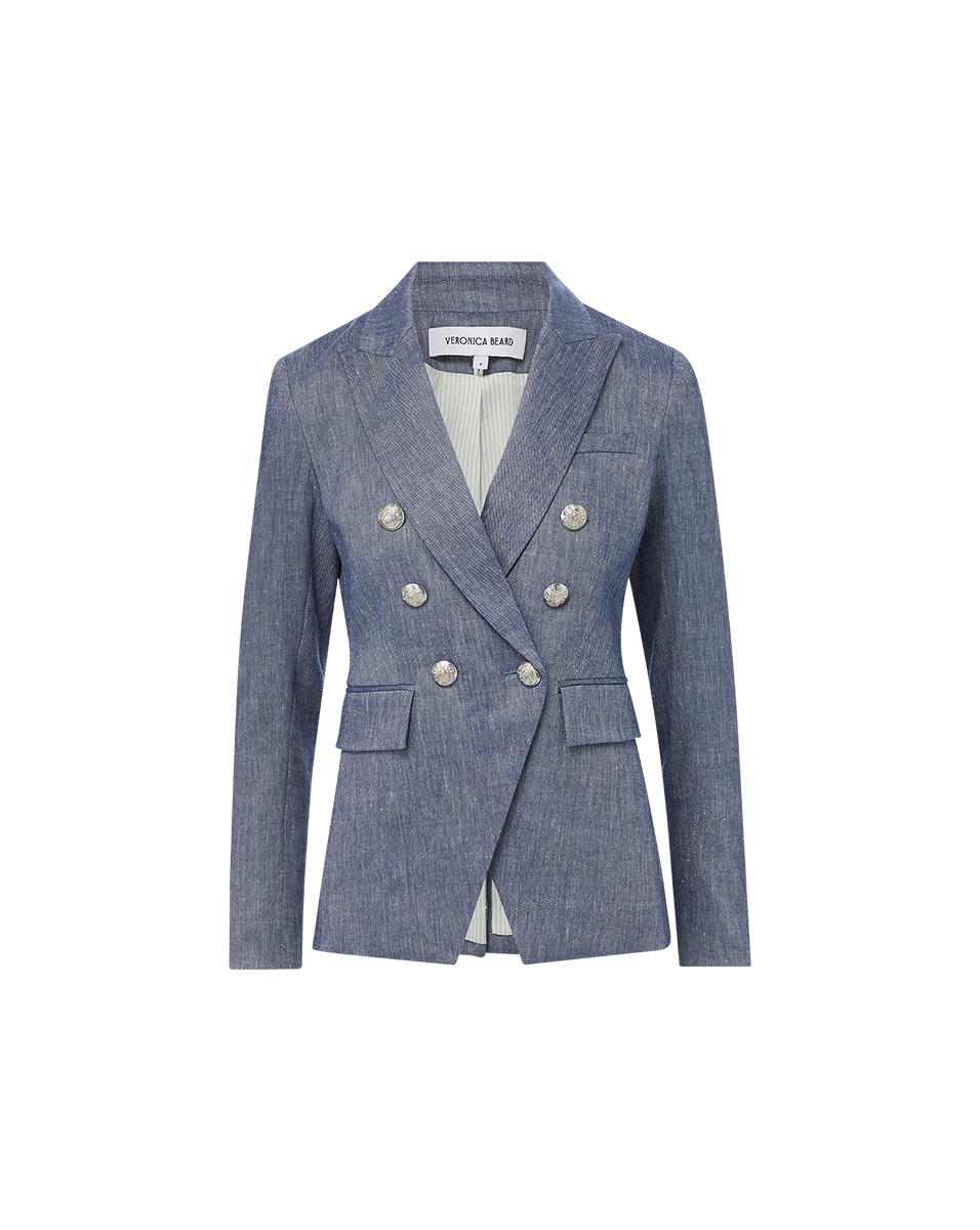 Product details Meet our latest Miller jacket—now updated for warmer weather. Made here in the US, in a stretch-linen blend, this refined and yet lightweight piece will pull all your looks together with ease. Plus, the gold crest buttons give the jacket a polished finish. Throw it over your favorite summer dress for the perfect day-to-night ensemble. - 53% Linen, 29% Recycled Polyester, 16% Viscose, 2% Elastane - Lined - Made in USA - Professional dry clean only - Style #CORESU211492