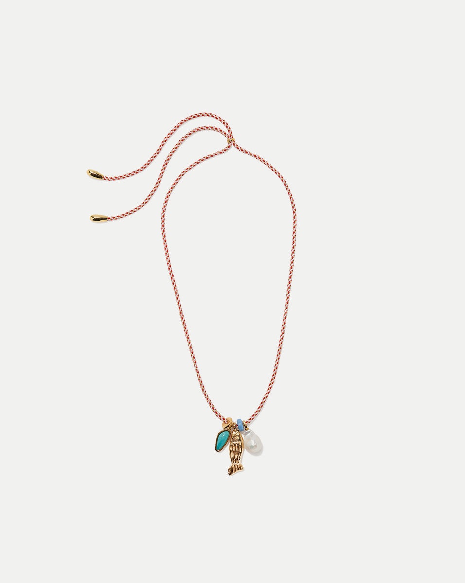 Product details Lizzie Fortunato is an NYC based luxury jewelry who pride themselves in dressing women who follow their own paths, not trends — women who are trailblazers, adventurers, collectors, artists, innovators, intellectuals, and dreamers. We love accessorizing women who dress to tell a story. - Adjustable red silk cord, glass and gold-plated beads, gold-plated etched fish pendant, freshwater pearl charm, and turquoise stone charm - Longest Drop: 14.75" - Style #PF25-N004
