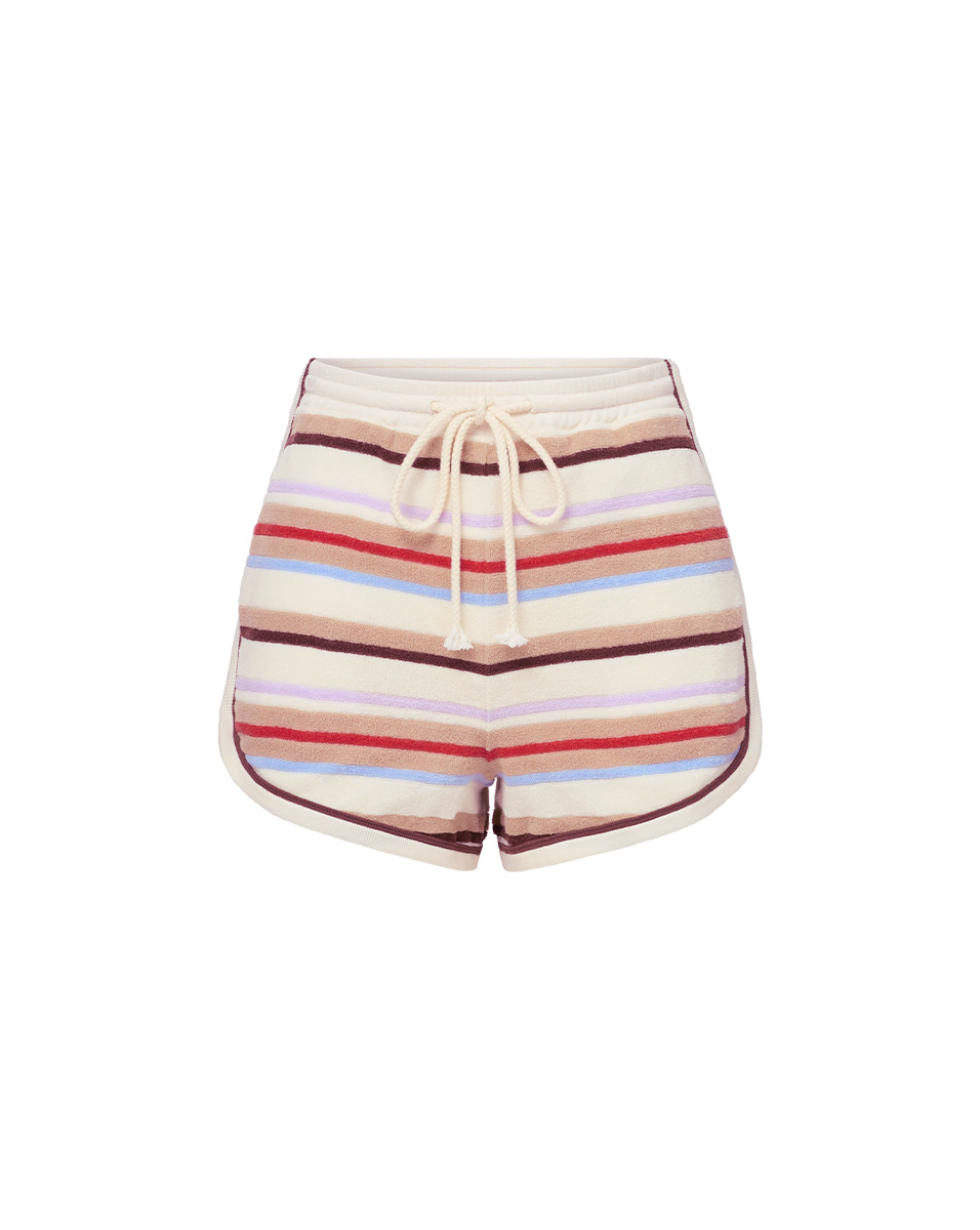 Product details Made from premium stretch cotton, the Mulberry short evokes all the chic nostalgia of the Seventies with its retro silhouette, multicolor stripes, and piped details. Finished with an elastic, drawstring waist, and a dolphin hem, this versatile wardrobe essential is a great warm-weather must-have. Sporty yet stylish, it's perfect for beach days, weekends, and getaways. - 77% Cotton, 23% Polyester - Unlined - Turn inside out and machine wash cold. Tumble dry on low. - Style #J2504JY16880328