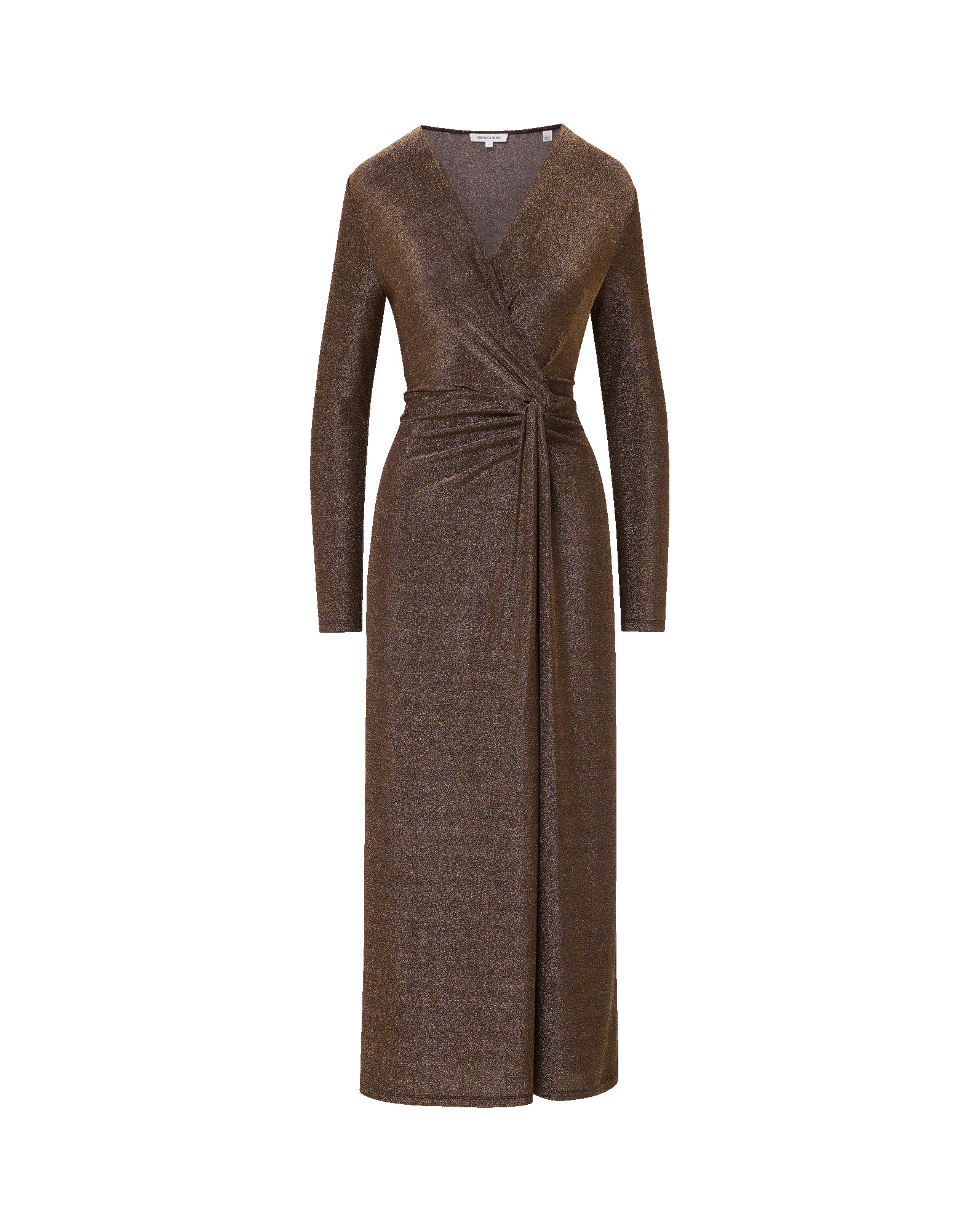 Product details The star of the show. Crafted in a high-shine gold stretch blend, the Neomie is an A-line midi dress with the look of a wrap dress. A knotted detail at the hip creates soft, flattering ruching, catching the light with every step. Finished with a flattering V-neck, this long-sleeve midi is ideal for date nights or special events—just add heels and statement earrings. - 75% Polyamide, 20% Metallic Fiber, 5% Elastane - Machine wash cold - Style #J2510JY9321778