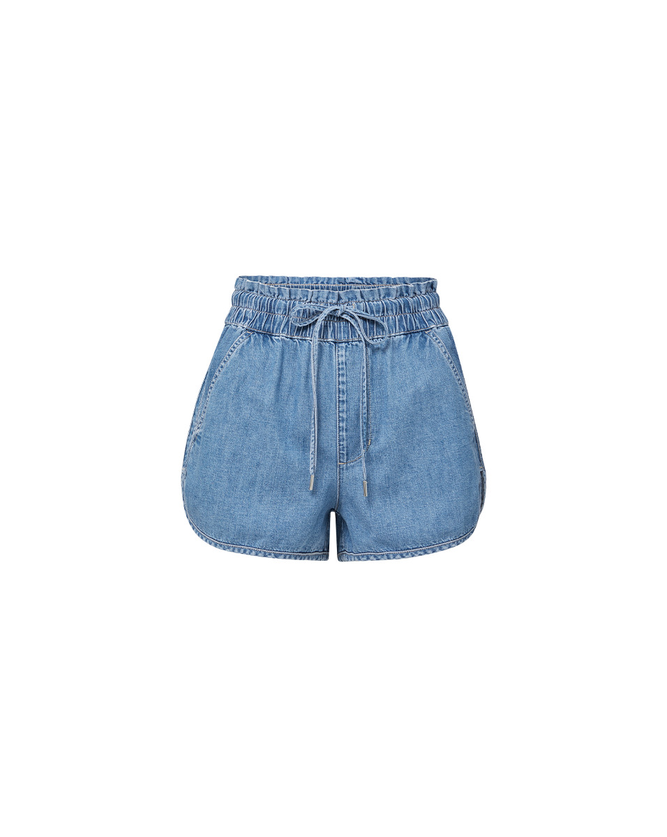 Product details Easy, effortless, and endlessly versatile, this is the perfect weekend short. Cut from lightweight, non-stretch denim, the Nessie short features a sporty dolphin hem and an elasticized drawstring waist for all-day comfort. Side slip pockets and a back patch pocket complete the look. Pair it with tanks or tees for a laid-back vibe, or go full double denim with a jean shirt or jacket. - 100% Cotton - Turn inside out and machine wash cold. Tumble dry on low. - Style #J25057100039AF