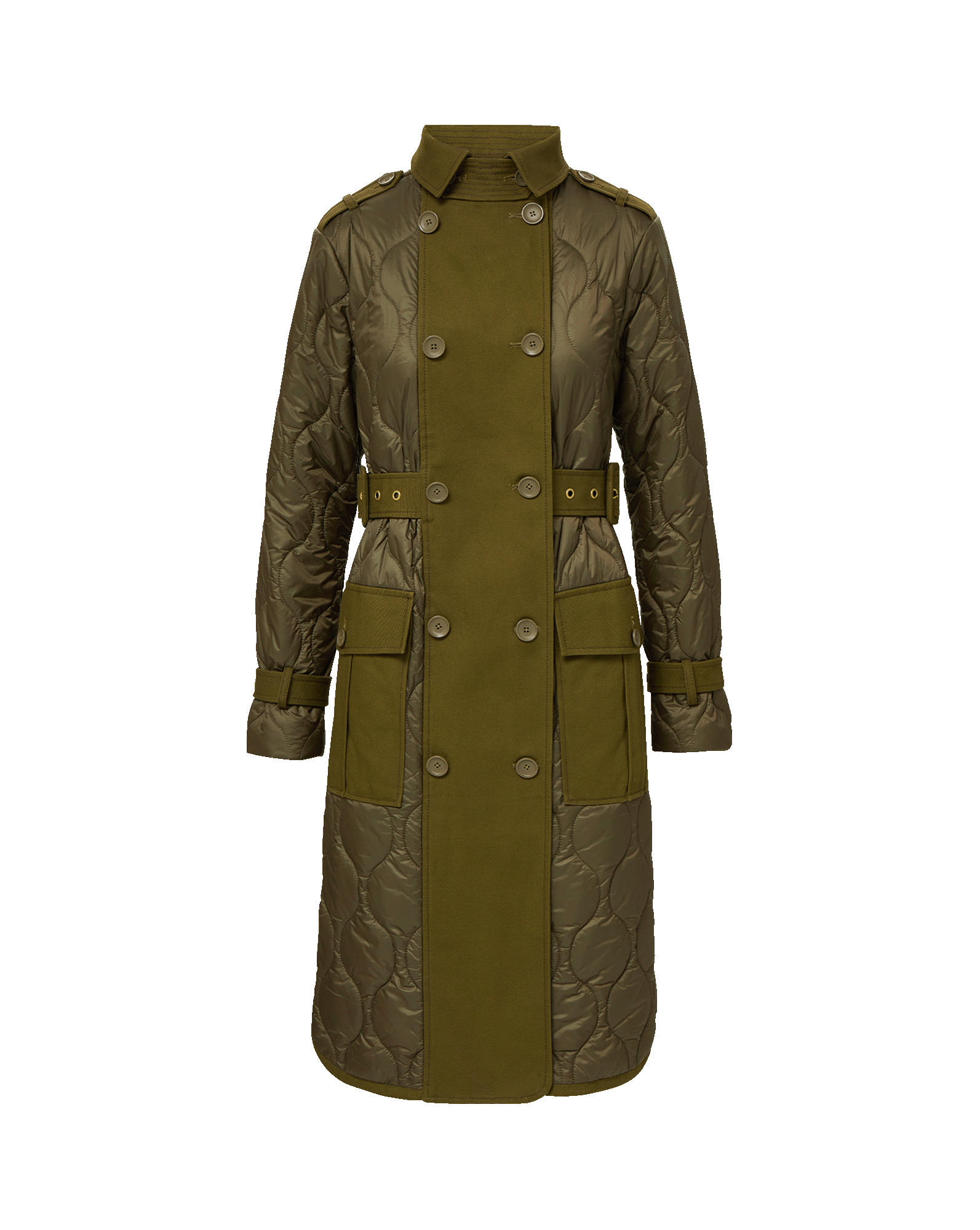 Product details The refinement of a trench coat meets the warmth of a puffer. The Newberry is crafted from premium lightweight nylon with a contrast cotton canvas collar and front placket. A single-breasted closure with additional side buttons creates the look of a double-breasted front, while a fitted waist and cutaway hem form a subtle A-line silhouette. A belted waist further defines the shape. A removable extra-long dickey—complete with a knit funnel neck and front zip—adds extra warmth and versatility. It’s a sleek staple you’ll reach for all season long. - 100% Polyamide; 100% Cotton Trim - Dry clean only - Style #2508OW8970372